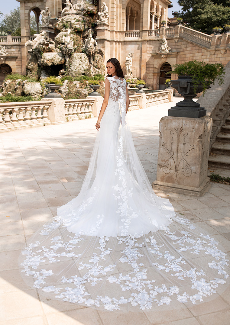 Come in un numero di magia, quest’abito a sirena a vita normale dà vita a un vero e proprio gioco di illusioni. L’effetto nudo dell’incredibile corpetto in tulle con ricami floreali crea un effetto seconda pelle su scollatura e schiena. La gonna con strascico, confezionata in crêpe, cinge i fianchi e si apre nella parte inferiore creando grande movimento e dinamismo. Le maniche scese, anch’esse in tulle, possono essere abbinate a uno spettacolare coprispalle a mantello in tulle. Disponibile nella collezione abiti da sposa Pronovias presso atelier Mod’Art Candiolo, Torino.