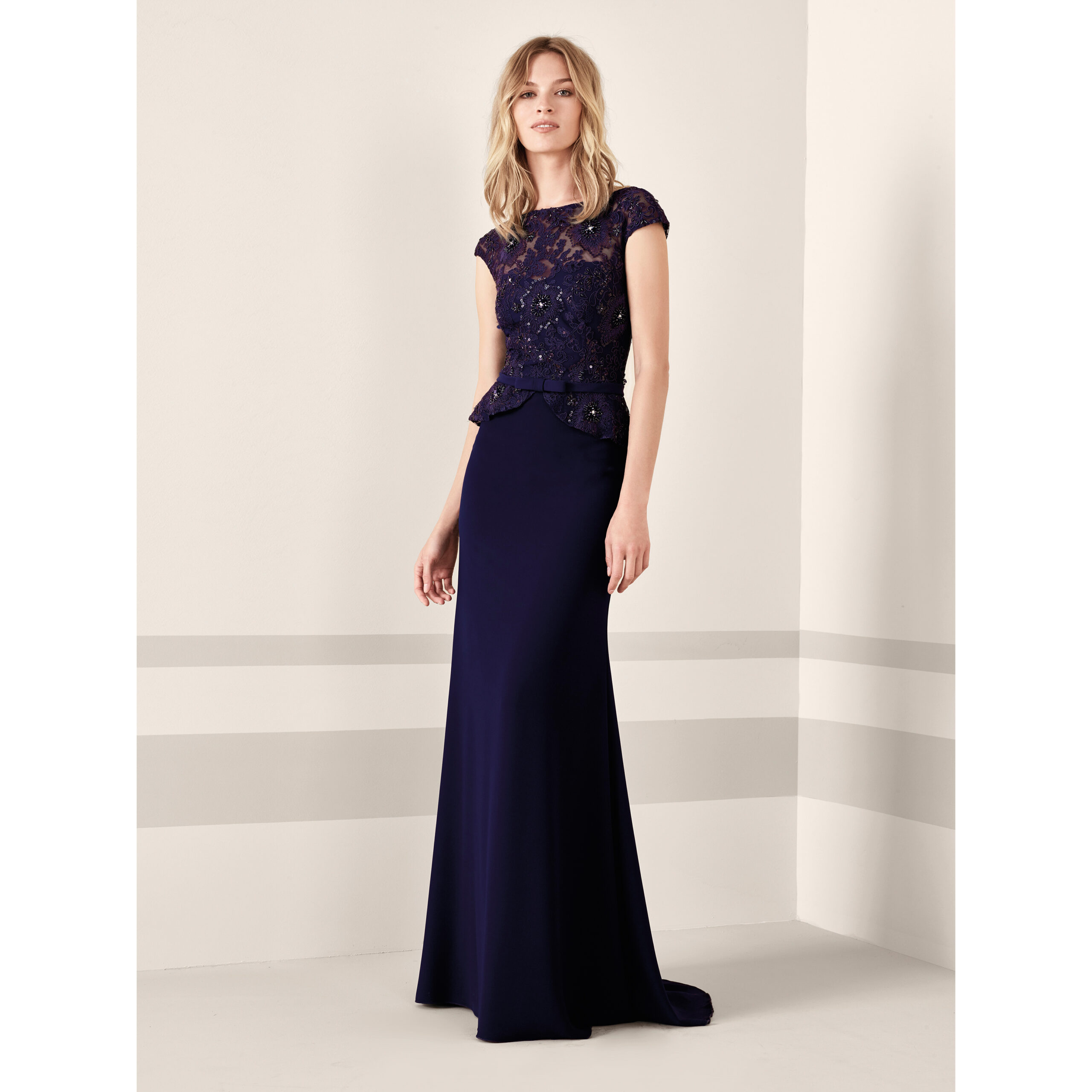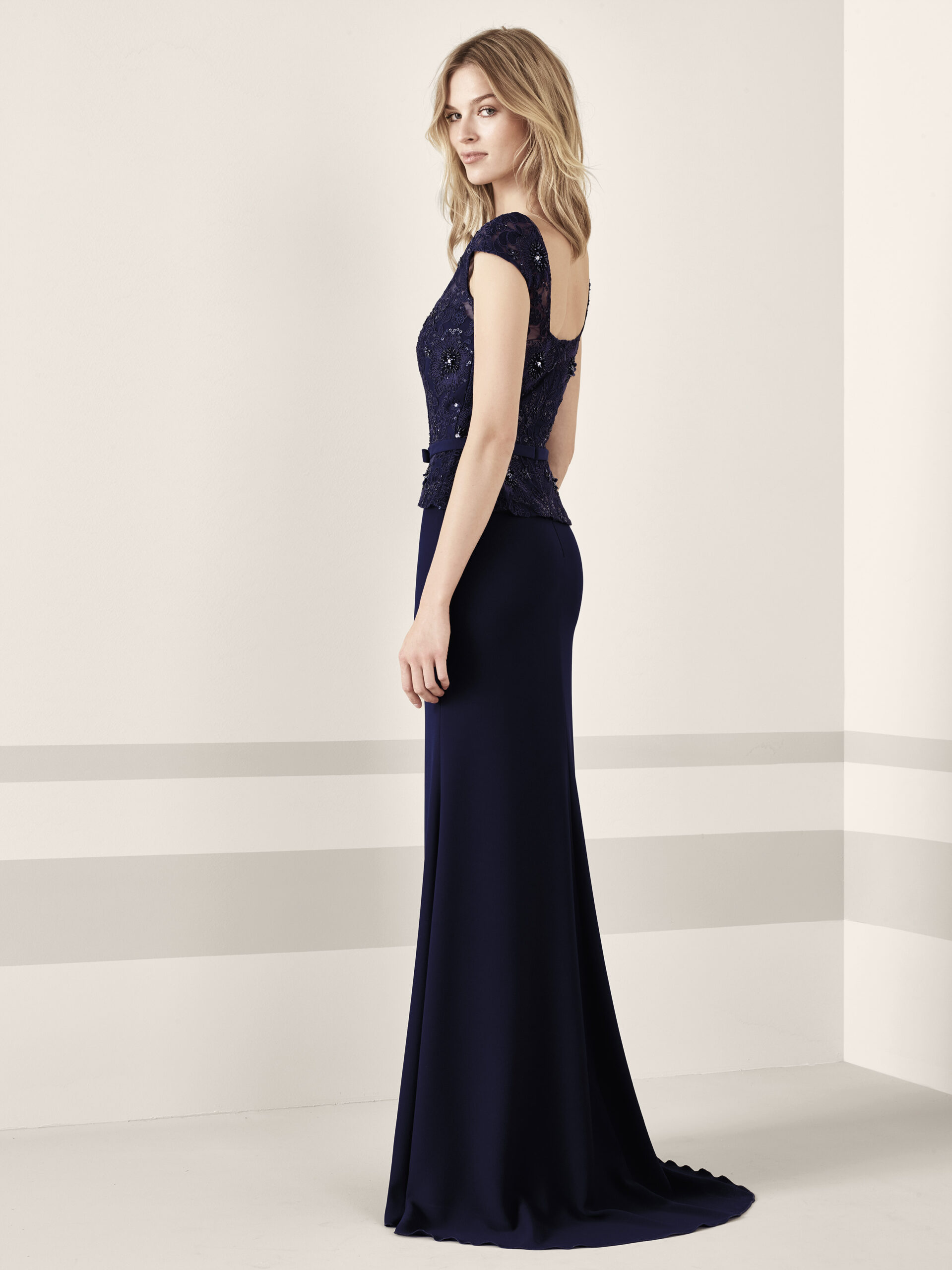 Un modello con gonna diritta, a vita normale e in crêpe, che si fonde con un corpetto con pizzo e strass. La scollatura a barca e la schiena rotonda giocano con le trasparenze della trama del pizzo e dei ricami, presenti anche nelle maniche corte. Disponibile nella collezione abiti da cerimonia Pronovias presso Mod’Art Candiolo, Torino.