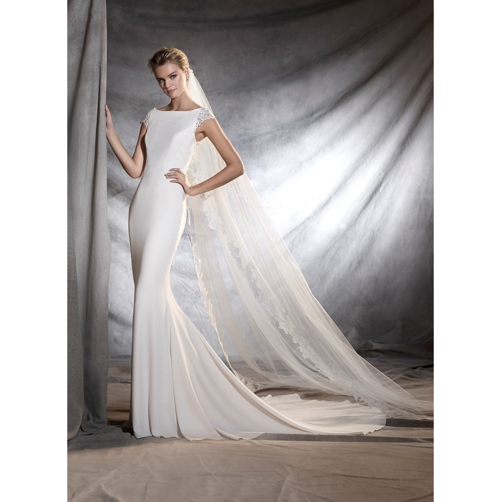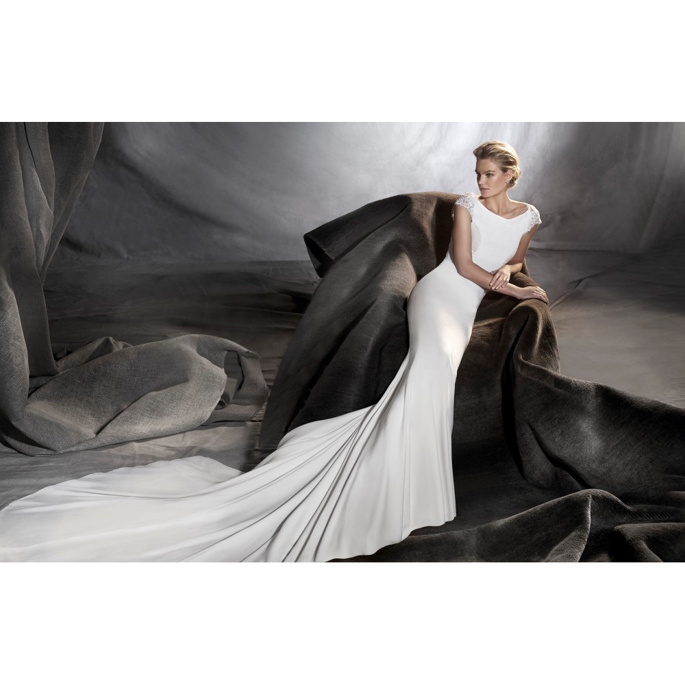 Sensuale abito da sposa in stile sirena confezionato in crêpe, tulle e con particolari di pizzo sulle maniche e sull’importante scollatura posteriore. Disponibile nella collezione abiti da sposa Pronovias presso Mod’Art Candiolo, Torino.